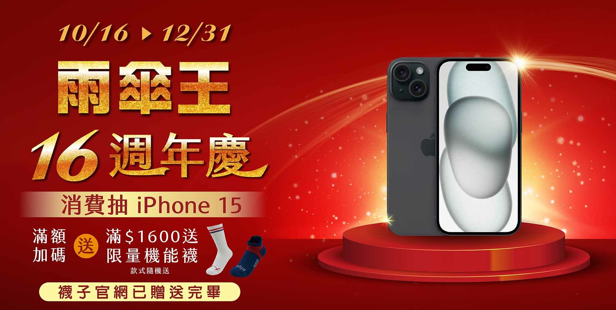 雨傘王16週年慶,不限金額消費抽iPhone 15