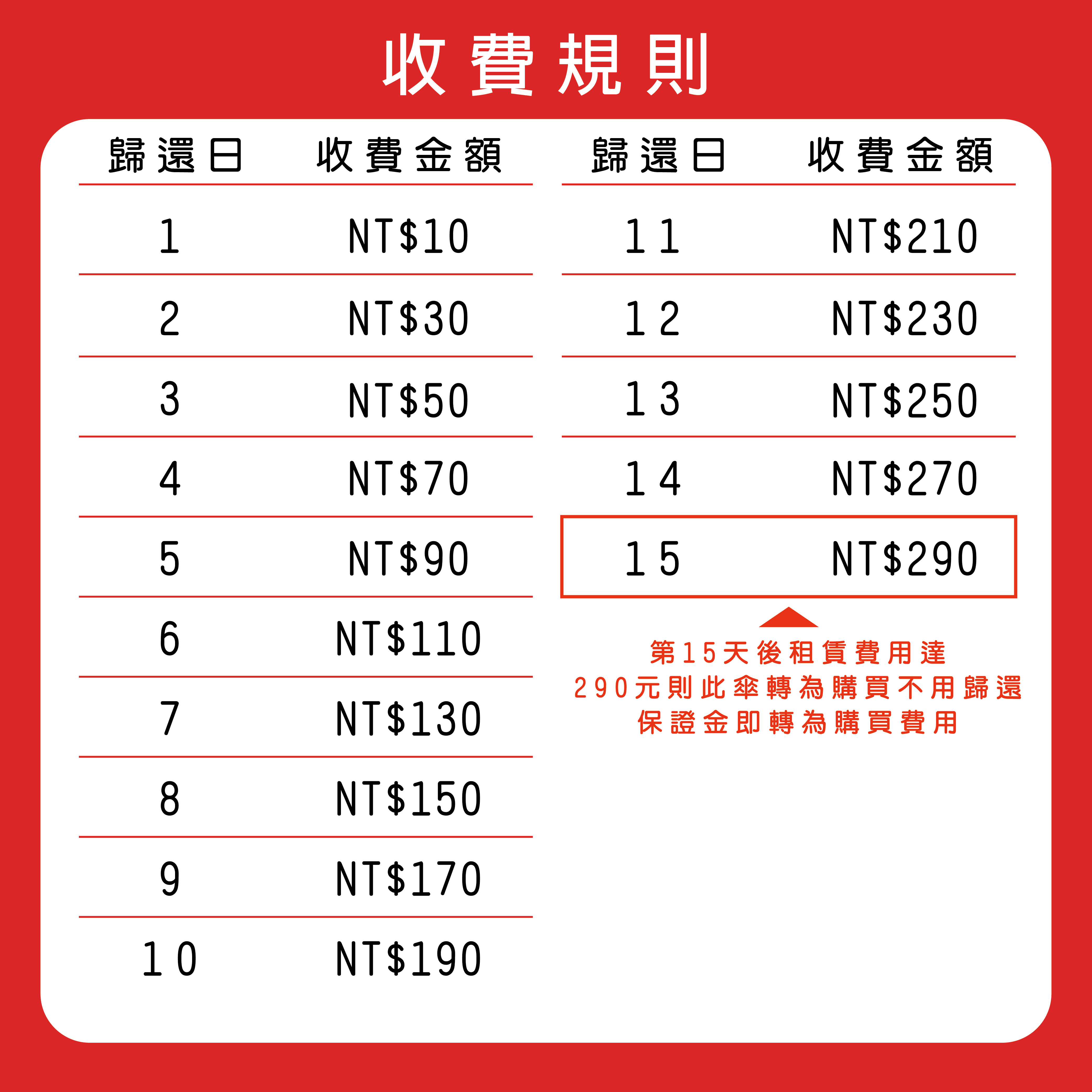 3、借用天起第一天10元,第二天開始每日租金20元以此類推,第15天後租賃費用達290元則此傘轉為購買不用歸還。保證金即轉為購買費用不得異議。
