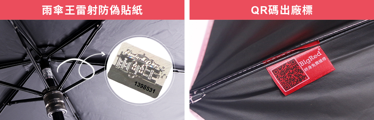 1、雨傘送修時,務必有維修卡、雷射防偽貼紙、QR碼出廠標。(如下圖,需有其中一項識別才受理維修)