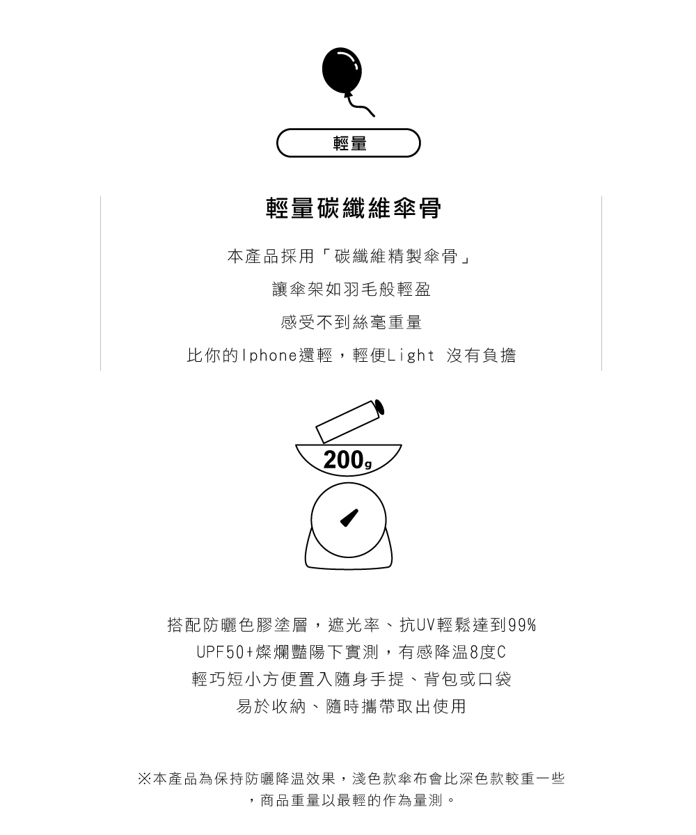 碳纖傘骨搭配黑膠,極致輕量隨身防曬