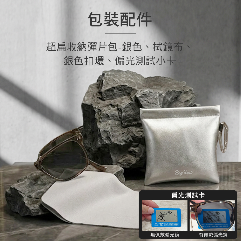 ・包裝配件:超扁收納彈片包-銀色、拭鏡布+銀色扣環、偏光測試小卡