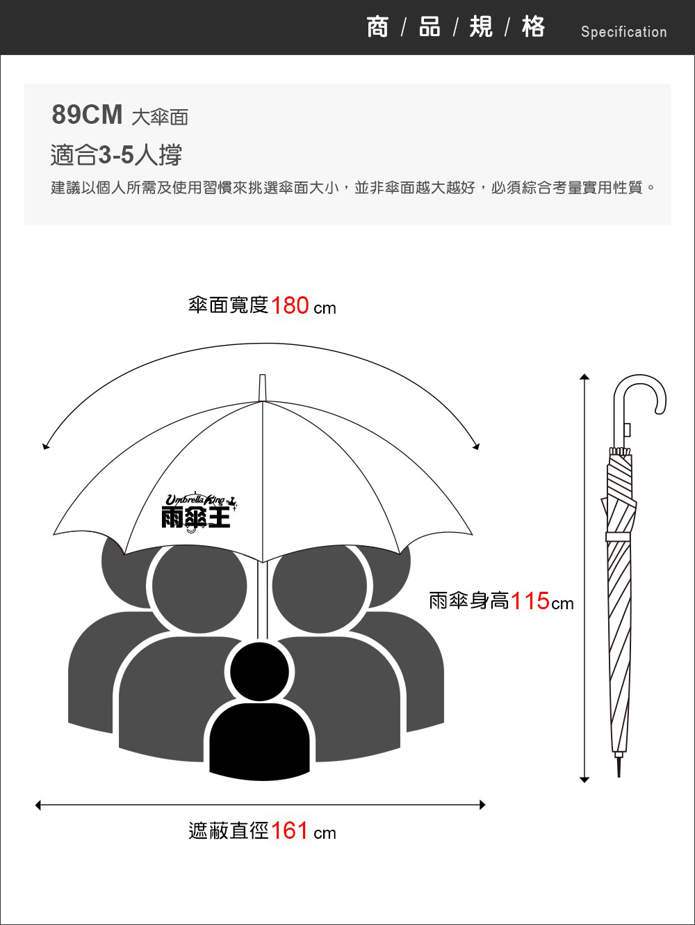 ☂傘面弧度180公分,傘下直徑161公分可容納3-5人撐