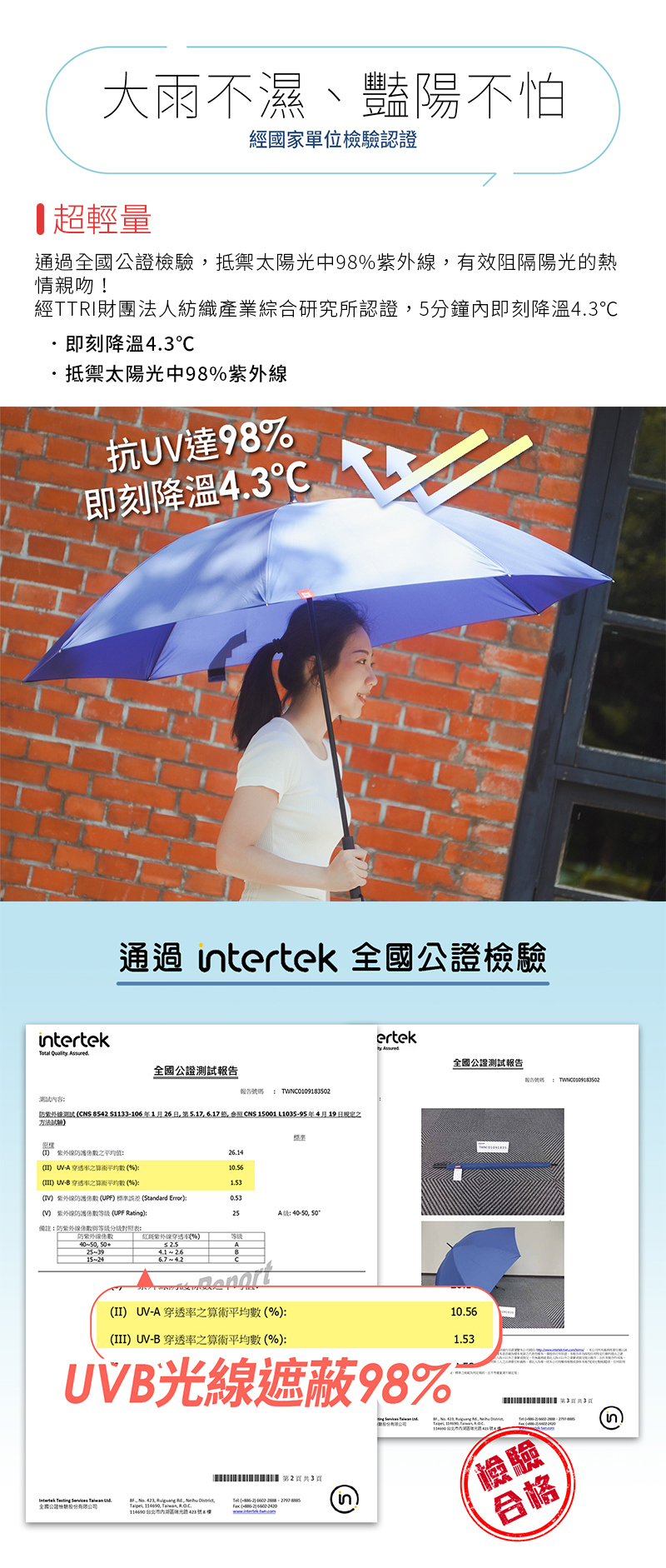 ☂通過第三方認證,抗UV光線遮蔽率98%,降溫4.3度