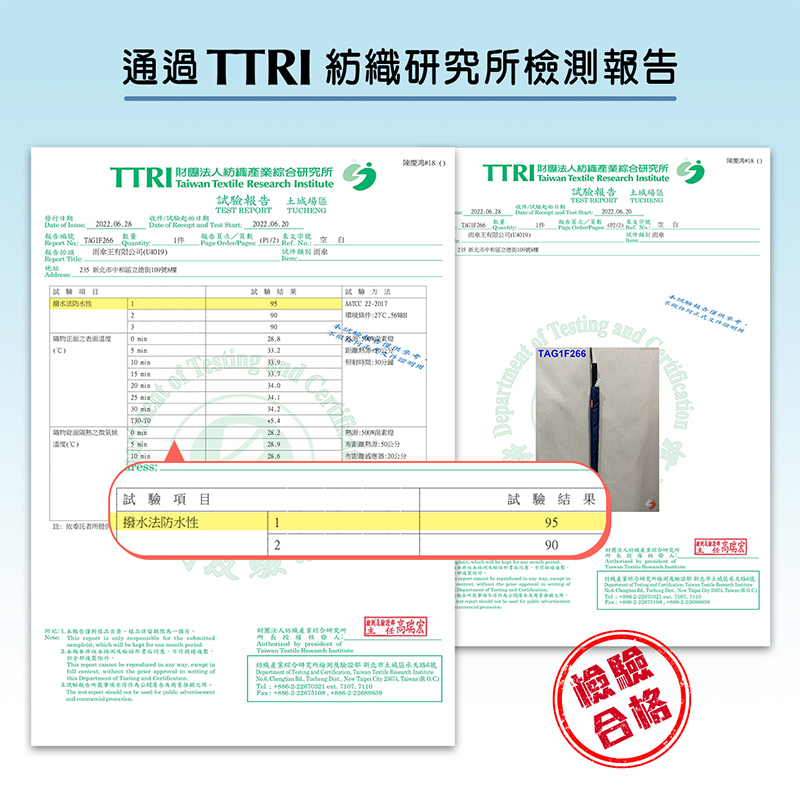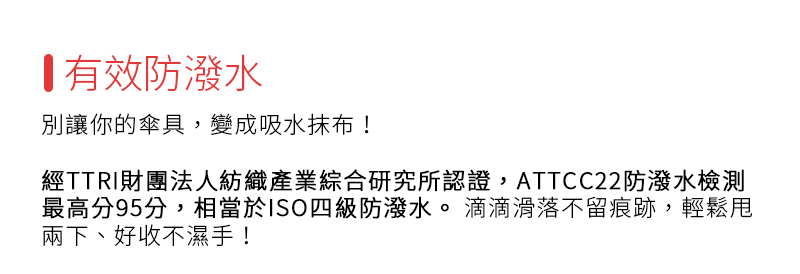 ☂有效防潑水最高達95分,滴滴滑落不留痕跡!
