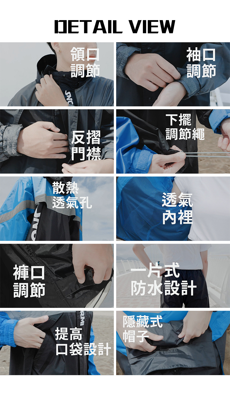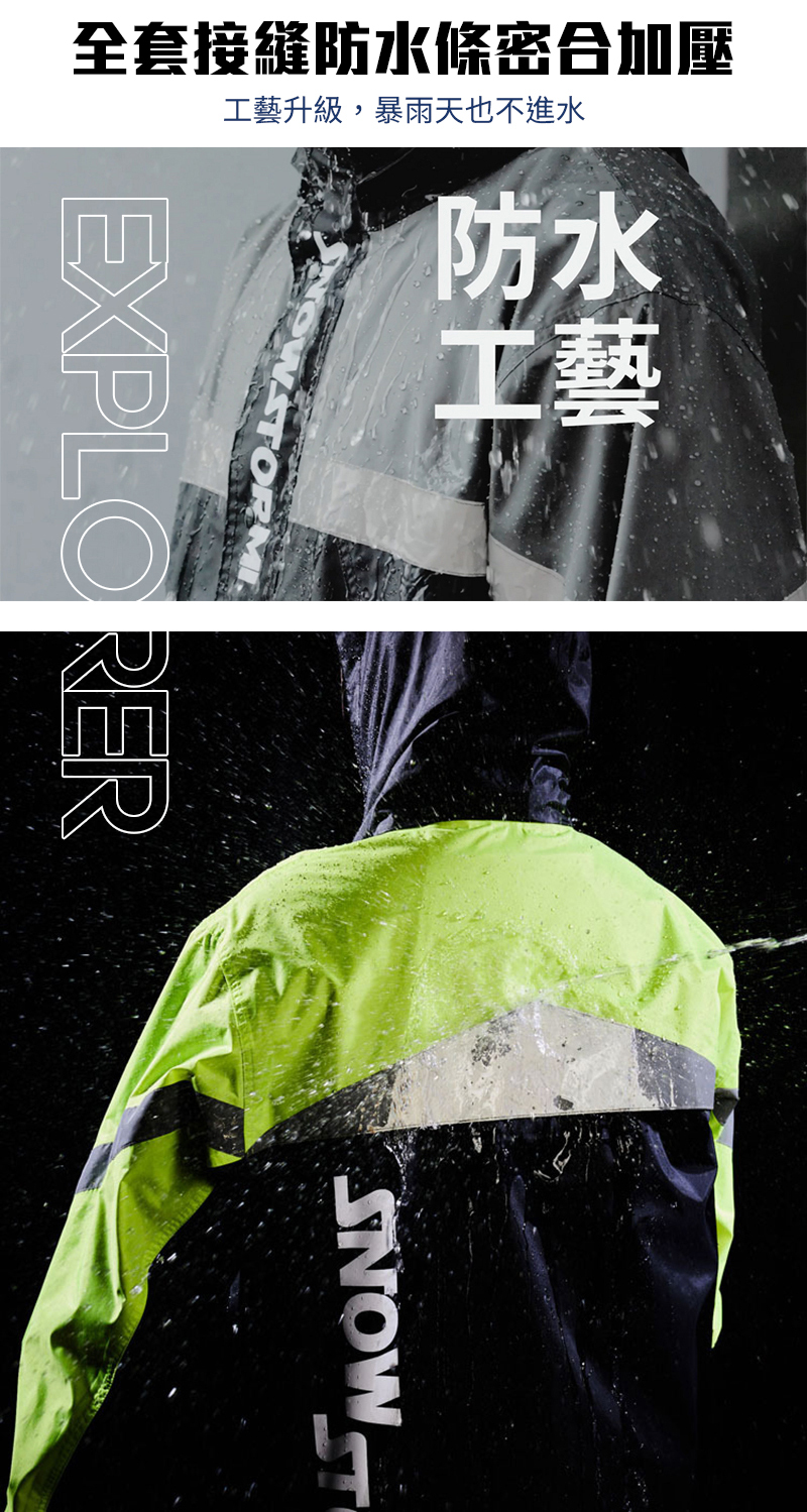 ☂門襟雙層擋片+反折設計,防止雨水倒灌,雨水阻隔在外