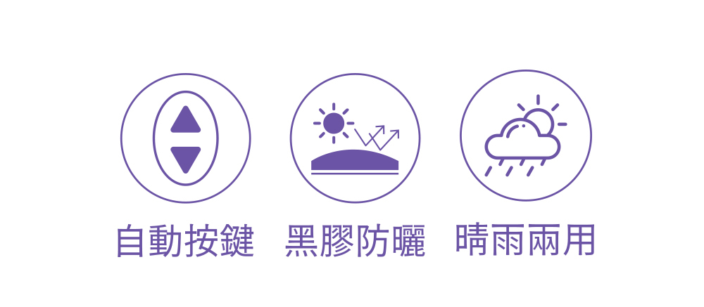 主要功能:遮陽、擋雨、抗UV、防風、防潑水、傘面自動開收(中柄手動壓回)