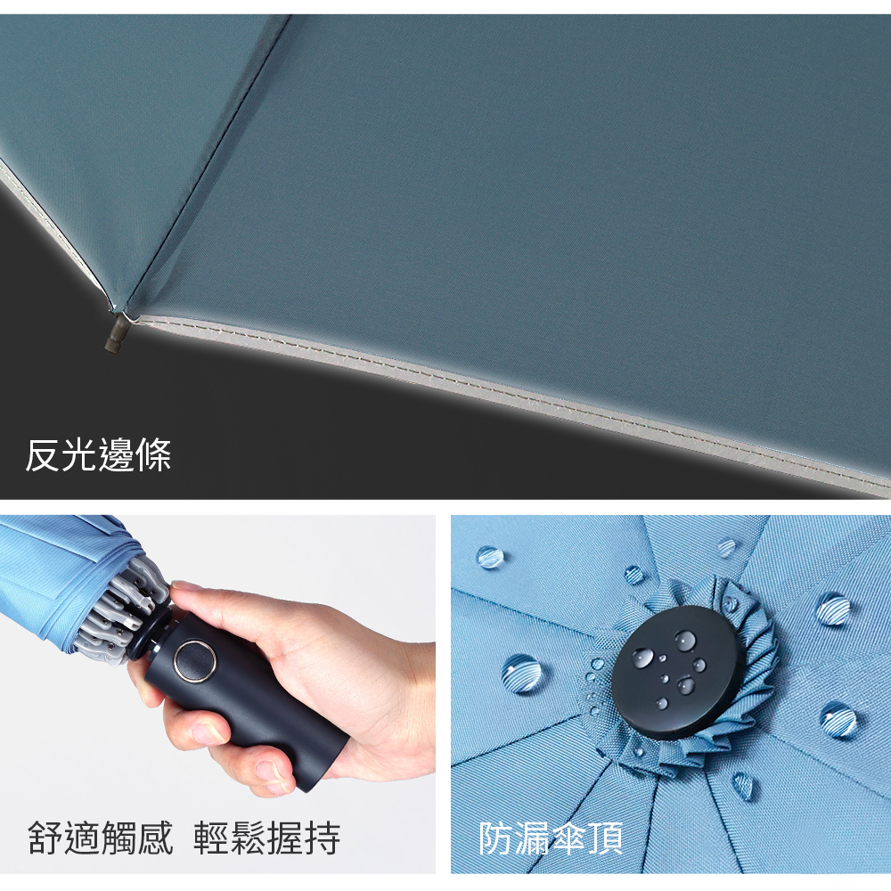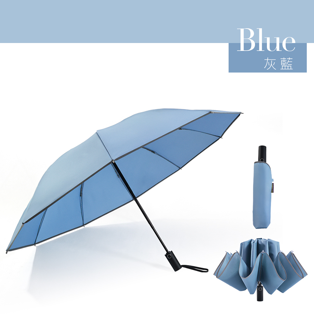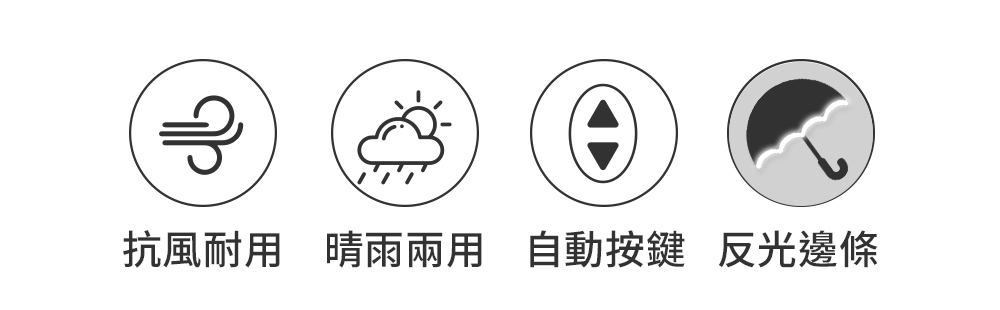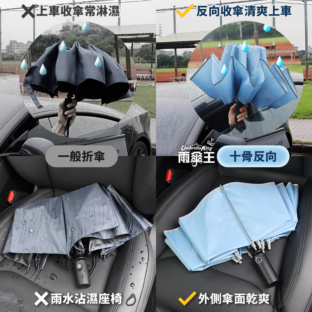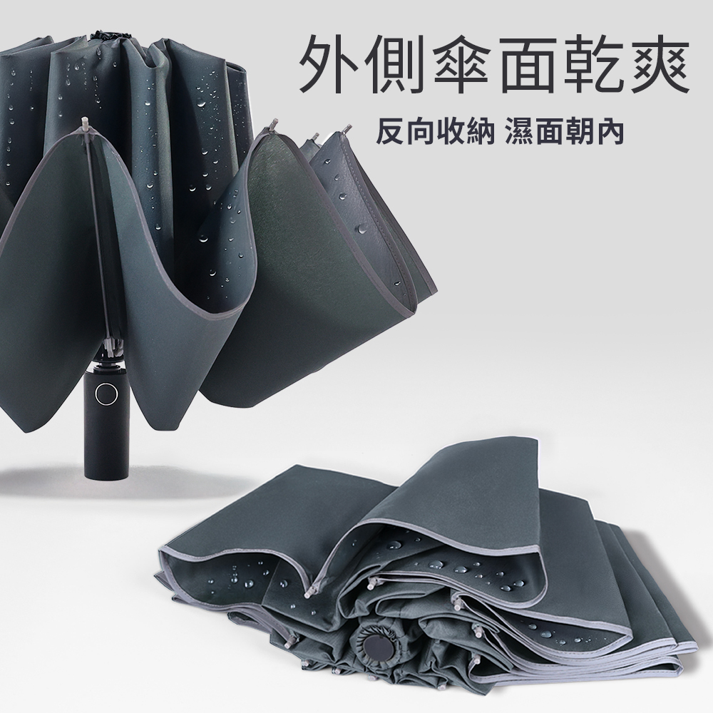 主要功能:反向收傘、遮陽、擋雨、抗UV、防風、自動開收(中柄手動壓回)