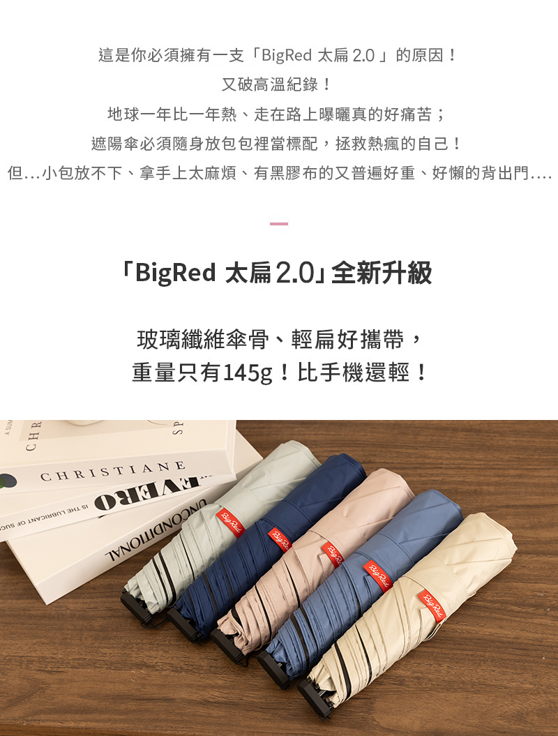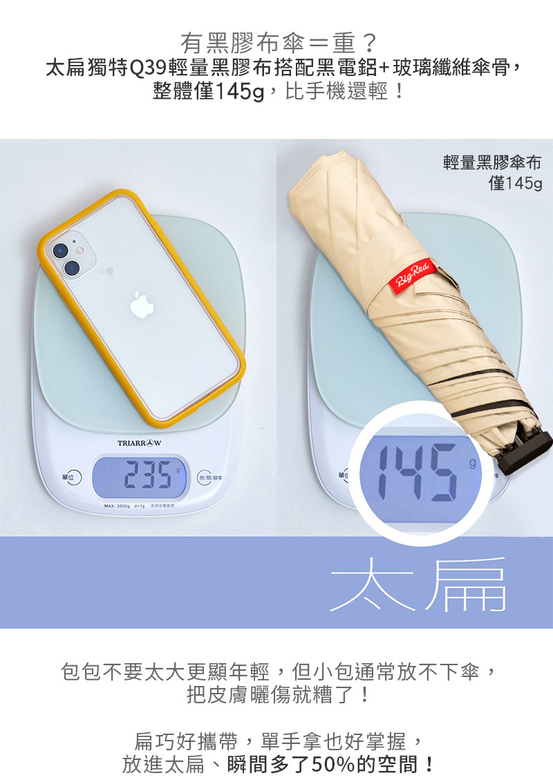 ☂骨架十分輕巧、玻璃碳纖維打造,重量只有145g、收起厚度僅2cm!