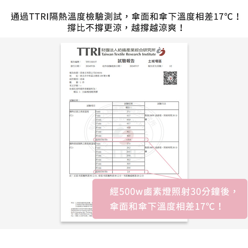 ☂通過第三方檢驗證實,擁有超頂規UPF50+,能有效降溫至少12℃!