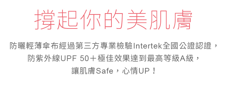 ☂防紫外線UPF 50+極佳效果達到最高等級A級,讓肌膚safe,心情up!