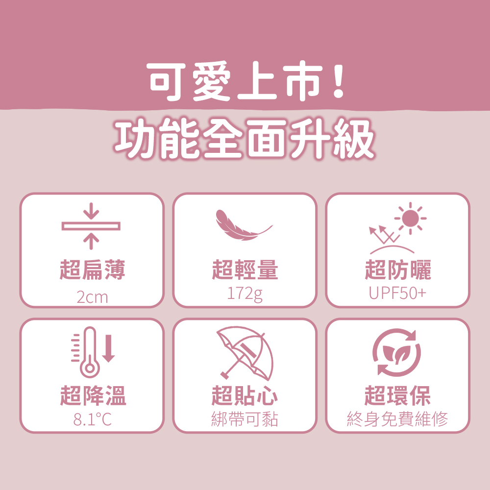 主要功能:超輕、扁型造型好收納、安全開關防夾手、防風、擋雨、手開、防曬、遮陽、降溫