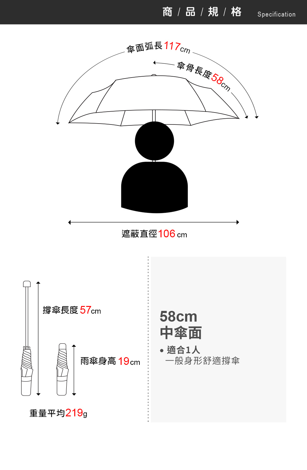☂58cm傘面展開剛剛好,一人使用完美遮蔽。