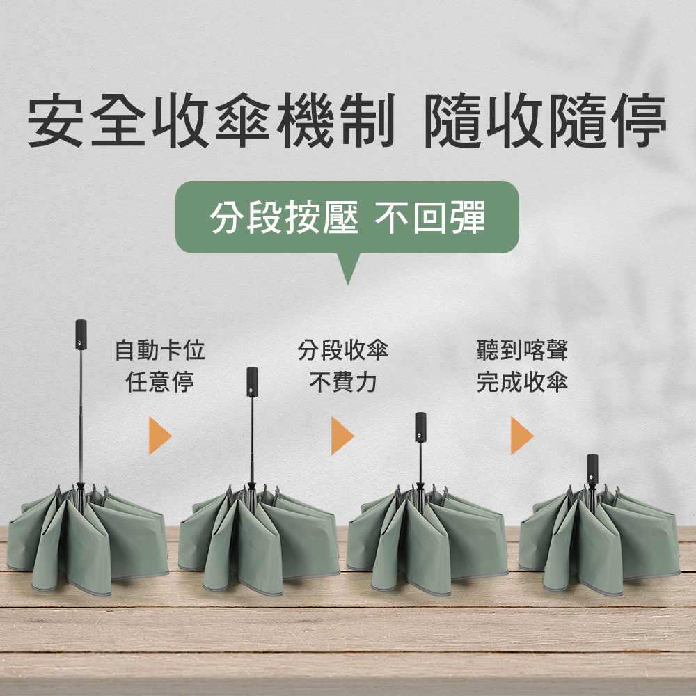主要功能:反向收傘、遮陽、擋雨、抗UV、防風、防潑水、安全自動開收(中柄手動壓回)