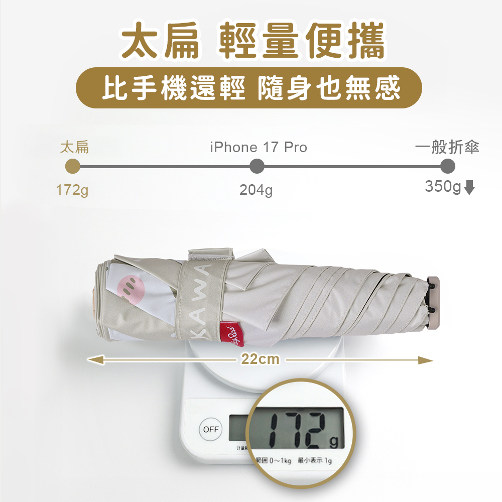 ☂玻璃纖維骨架,超輕量172g、收起厚度2cm